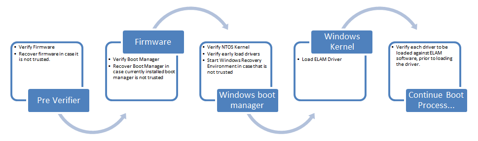 يك مكانيسم حفاظتي كه در ويندوز 8 معرفي شده است بارگذاري يك درايور اوليه ضد بدافزار (ELAM ) است كه تضمين مي كند حداقل اجراي بعضي از نرم افزارهاي ضد بدافزار در سيستم امكان پذير است. نرم افزار ELAM با الزام حفاظت زمان بوت، توسط كمك به تأييد ديگر درايورها هنگامي كه بارگذاري مي شوند، باعث بهبود فرآيند بوت امن مي شود.
